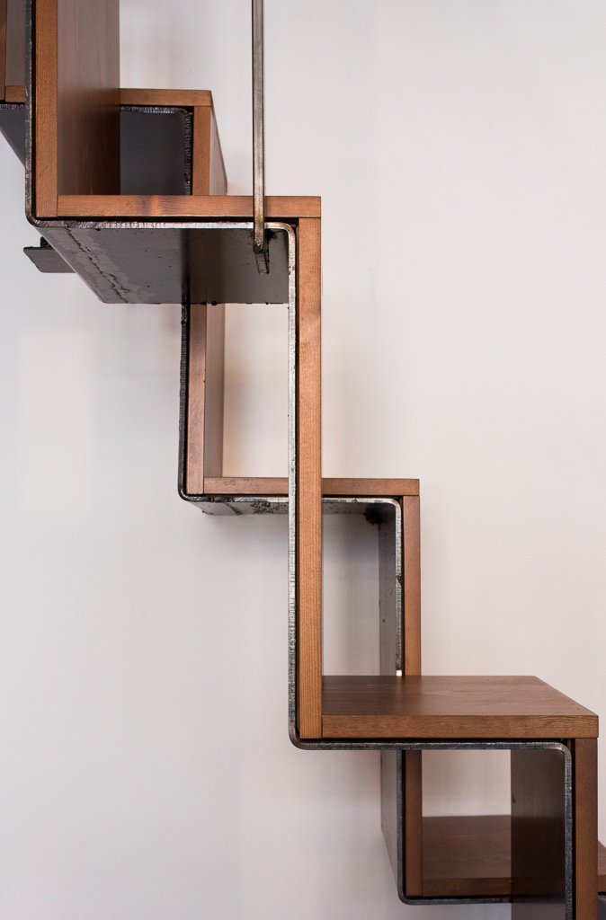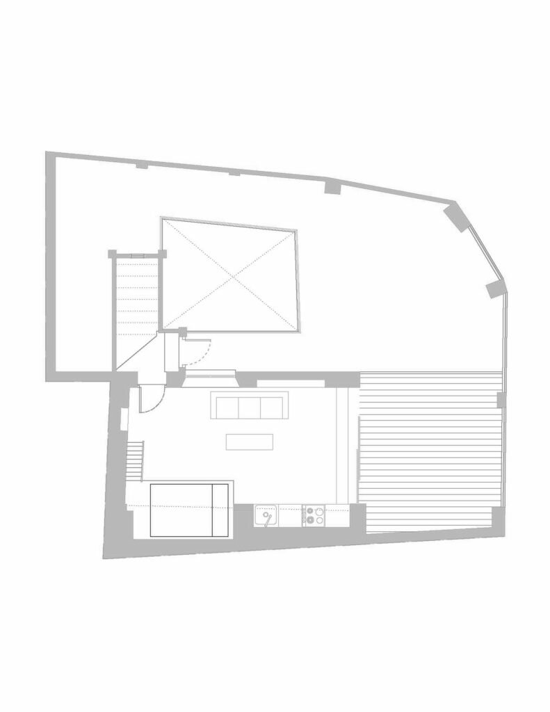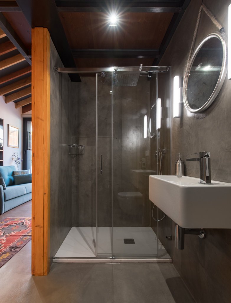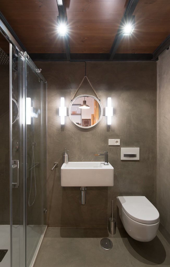 Un elemento a modo de prisma rectangular ocupa una de las zonas medianeras del ático. Dicho volumen está revestido en su contorno mediante paneles de acero en su color natural, formando una caja metálica que se cierra mediante un frente de puertas tipo de granero que oculta el baño. La arquitectura del ático ayuda a la hora del diseño del interior del espacio por el toque industrial que le aporta la estructura inclinada del techo con vigas de madera aserradas que se tiñen en distintos colores.