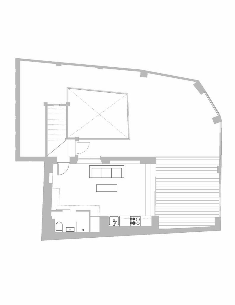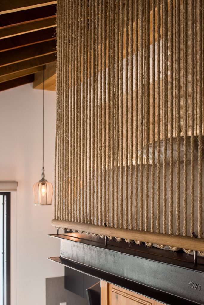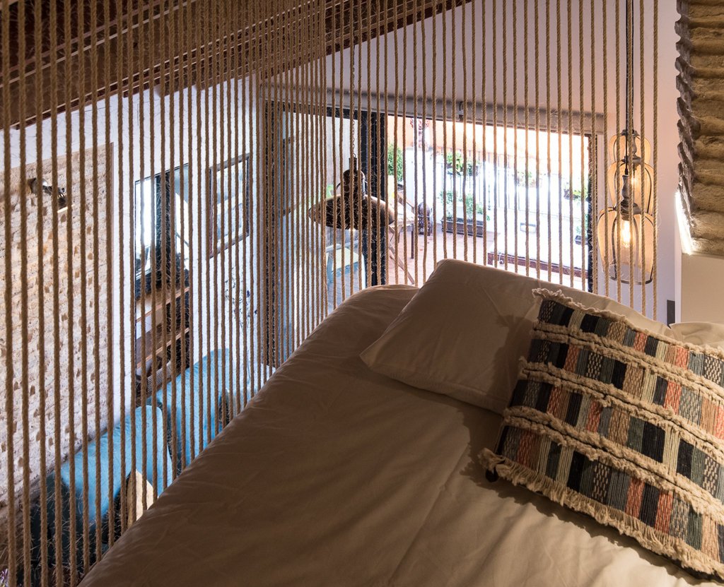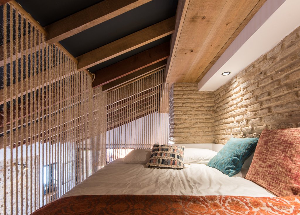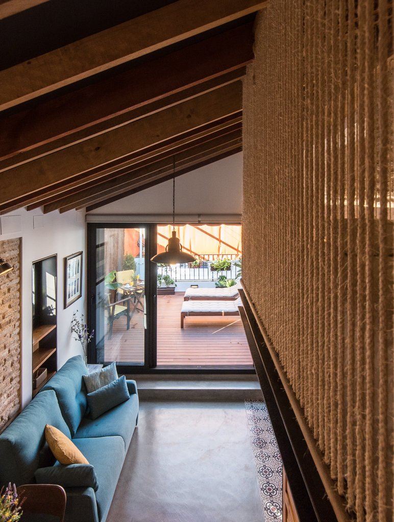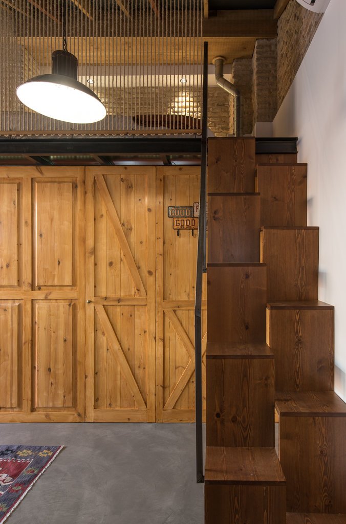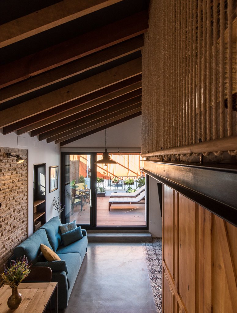 El tamaño del loft no es demasiado grande pero la altura del techo da sensación de amplitud, en su máxima pendiente se juega con una zona de altillo a doble altura sobre la caja metálica que oculta el baño, a dicho altillo se accede por una escalera mínima de acero y madera para albergar una cama que se insinúa a través´és de una celosía de cuerdas.