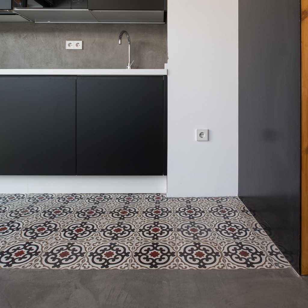 El pavimento continuo de microcemento en grises oscuros metalizados sigue aportando al ambiente el estilo que lo caracteriza, así como el ladrillo visto recuperado y el solado hidráulico en la zona de cocina abierta.