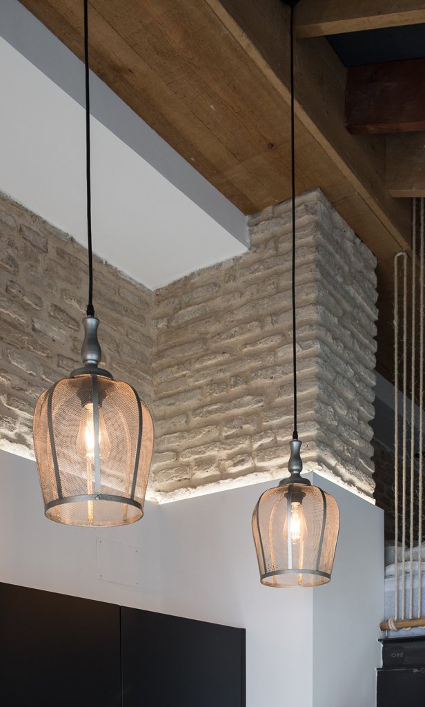 Las estanterías ejecutadas por un contorno perimetral de paneles de acero con baldas de madera y la mesa de comedor, se han hecho expresamente a medida de los espacios. Las lámparas colgantes aportan el estilo vintage.