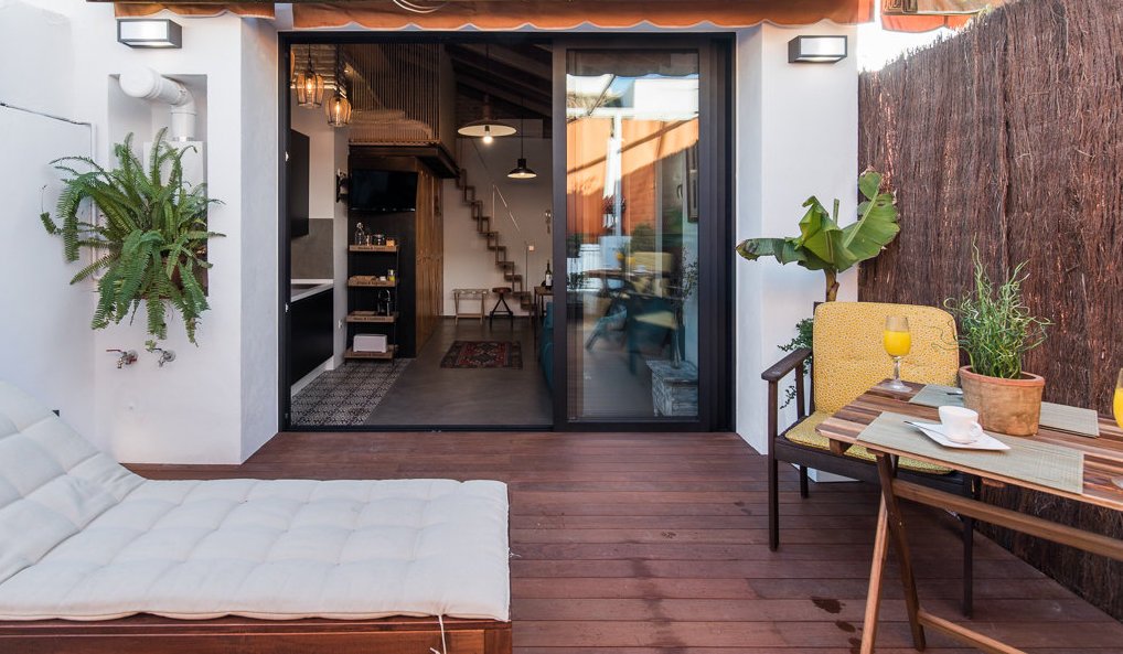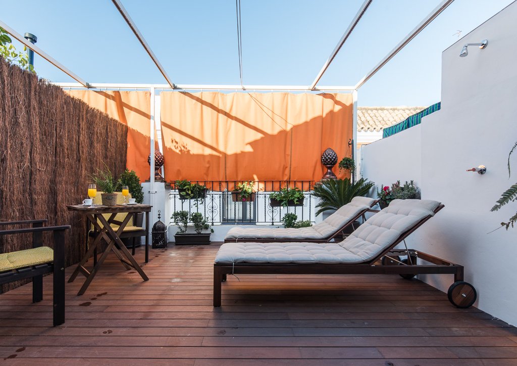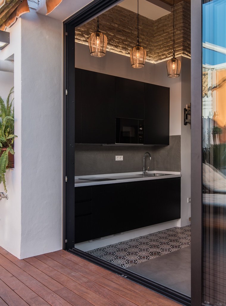 La carpintería metálica de tres hojas correderas del corrimiento exterior da paso a una terraza solarium con pavimento de tarima de madera de IPE, a su vez aporta una entrada de luz natural que llena de calidez el ambiente.