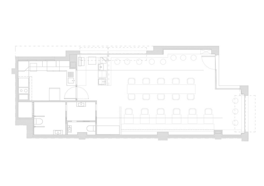 En este sentido cabe destacar un banco corrido de 6,00 metros de longitud suspendido con una barra cuelga cojines sobre el respaldo que da servicio a 6 mesas individuales de diseño propio. Una de las atracciones del local es una amplia mesa central compartida muy al estilo europeo, e igualmente mostradores integrados en las carpinterías exteriores que comparten comensales desde el interior y exterior del local.
