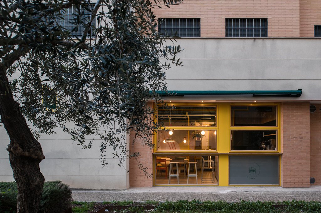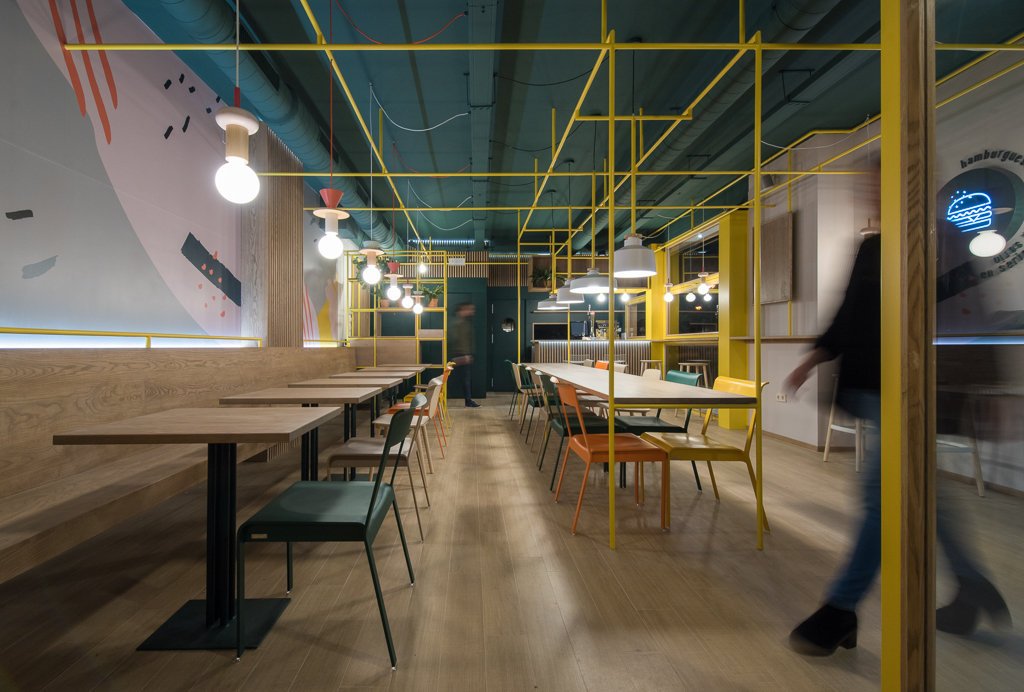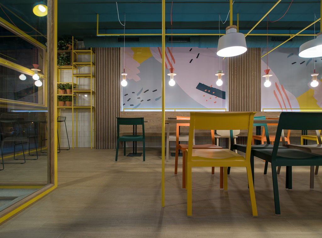 El diseño interior está marcado por el uso de materiales como la madera de fresno y el acero pintado con los colores corporativos amarillo “senf” y verde “pine” de la nueva identidad visual.