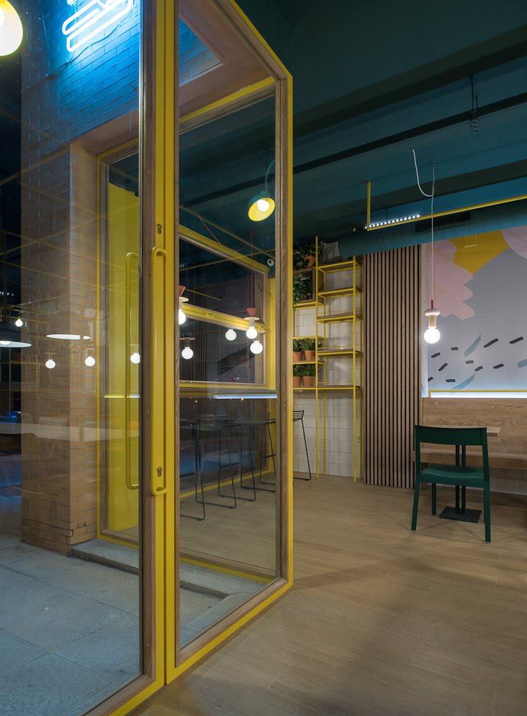No es menos singular el diseño de la carpintería del cerramiento exterior, ejecutada con hojas de apertura basculantes de grandes dimensiones que consiguen una conexión total con el exterior de local.